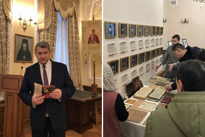 Участники форума надолго задержались у книжной выставки духовных артефактов «Аз Буки Ведаю», на которой были представлены редкие книги и старинные иконы двух минувших веков.