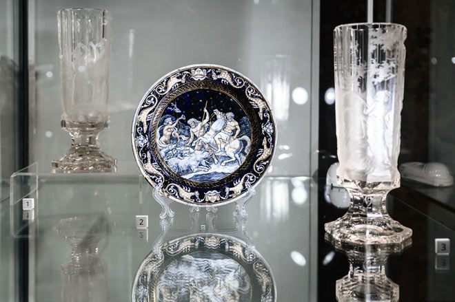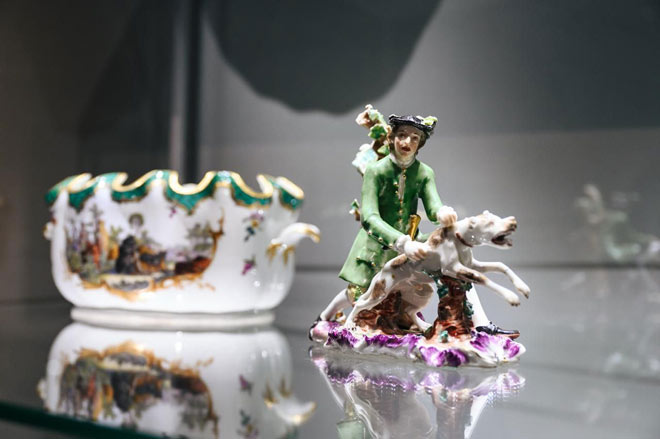 Масштабная экспозиция поделена на два тематических блока. Центральное место в первой части выставки отведено предметам из знаменитого «Охотничьего сервиза» Мейсенской фарфоровой мануфактуры. Все изделия в этом сервизе, от самого большого до самого маленького, украшены ни разу не повторяющимися охотничьими сценами.