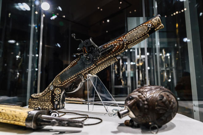 Особый интерес представляет кремневое ружье-трость короля Нидерландов Вильгельма Первого, созданное в первой трети XIX столетия в Брюсселе. Изделие инкрустировано бронзой и украшено вставками из черного дерева и кости. Внимание посетителей привлечет и самый большой экспонат на выставке – ружье «уточница», длина которого составляет более трех метров. Это редкий и хорошо сохранившийся экземпляр оружия, предназначенный для вспугивания птиц с водной поверхности.