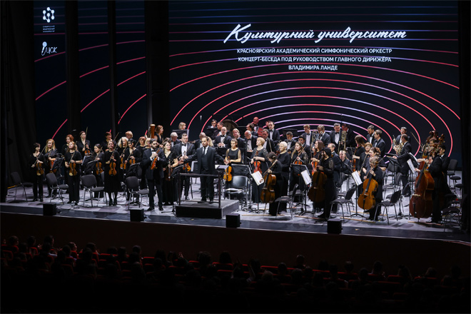 По инициативе Губернатора края Михаила Котюкова Красноярская филармония совместно с Сибирским федеральным университетом провела первый просветительский концерт-лекцию, в ходе которого Красноярский академический симфонический оркестр под управлением дирижера Владимира Ланде исполнил классические произведения, сообщает пресс-служба Министерства культуры Красноярского края.