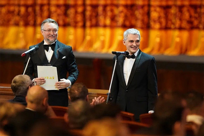 Мероприятие прошло в Большом зале НОВАТа. Праздничный вечер открыли музыкальным номером отцы‒основатели нового русского театра режиссеры Владимир Иванович Немирович-Данченко и Константин Сергеевич Станиславский, образы которых воплотили студенты новосибирской консерватории.